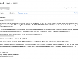 Siang-siang itu saya lagi di kos, lagi nyantai tengah siang, besok quiz matem, tapi ga bisa belajar karena kepikiran nunggu hasil NTU. Tiba-tiba, hp saya dapat notifikasi ada email dari NTU. Panik sekali. Ketika saya buka..