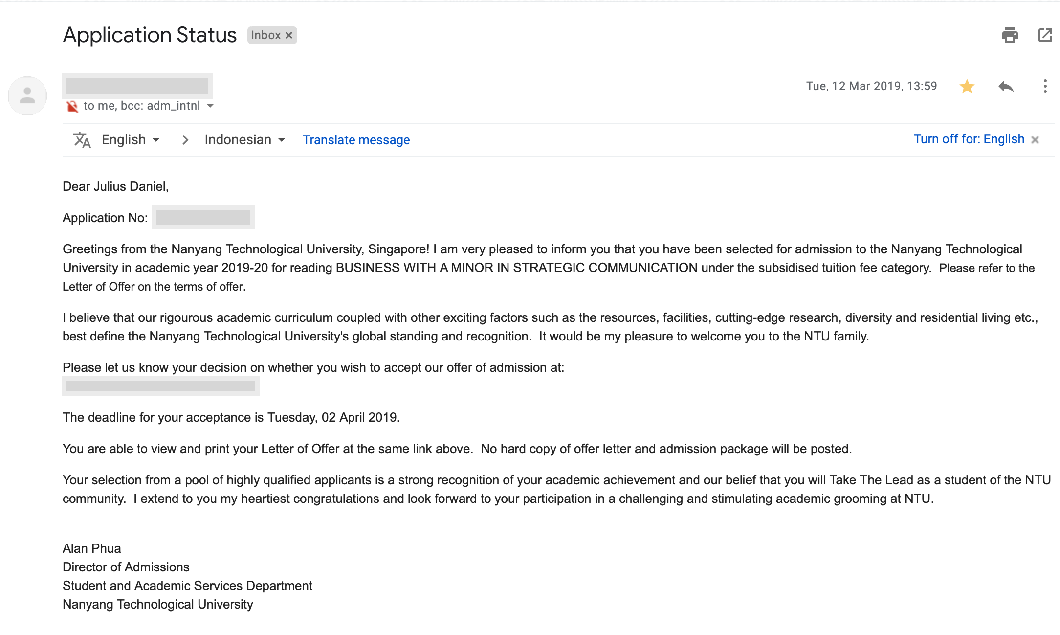 Siang-siang itu saya lagi di kos, lagi nyantai tengah siang, besok quiz matem, tapi ga bisa belajar karena kepikiran nunggu hasil NTU. Tiba-tiba, hp saya dapat notifikasi ada email dari NTU. Panik sekali. Ketika saya buka..